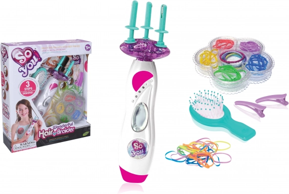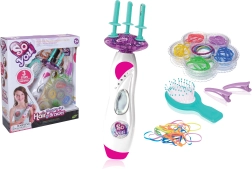 - Balení obsahuje: zaplétač, kartáč, gumičky, sponky, skříňku na gumičky, návod