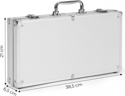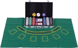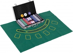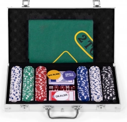 Dostanete kompletní soupravu všech potřebných prvků pro hraní pokru a blackjacku, vše úhledně uloženo v přenosném kufříku.
