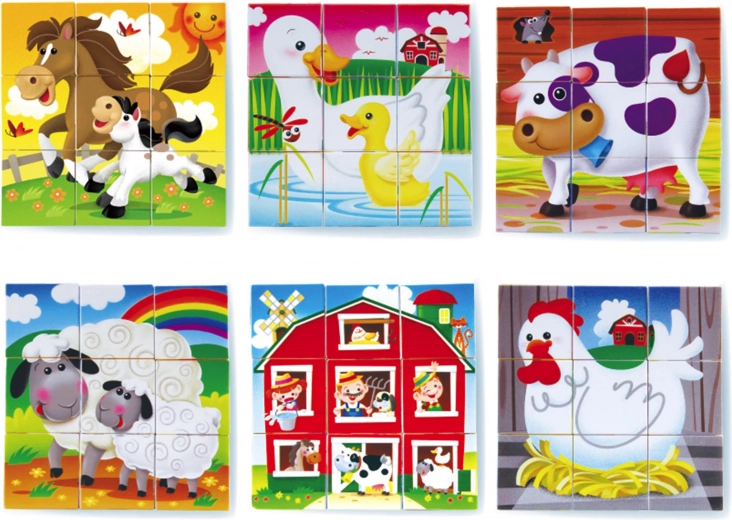 Objevte kouzlo farmy s lehkými plastovými kostkami, které jsou snadno uchopitelné i pro malé dětské ručičky. Každá strana kostek tvoří jiný obrázek, takže děti mohou skládat 6 různých motivů a učit se rozpoznávat tvary, barvy i souvislosti.