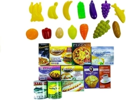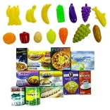 Součástí balení je pestrá sada ovoce, zeleniny a dalších potravin, které podporují učení formou hry: poznávání barev a tvarů, rozvoj slovní zásoby a pravidel nakupování. Lehká plastová a kartonová provedení usnadňují manipulaci i čištění.