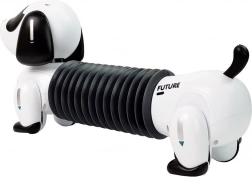 Robotický pes je návrhem budoucnosti s ohledem na moderní technologie. Jeho černobílý vzhled s efektem harmoniky umožňuje pohyblivost a flexibilitu.