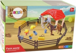 Sada zahrnuje nástroje potřebné ke každodenní údržbě farmy a stáje - tříkolka, vidle, seno, koryta a další.