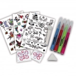 Vytvořte své vlastní originální tetování nebo si zkuste přetvořit oblíbené motivy. Sada je snadno použitelná a zábavná pro každou příležitost.
