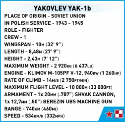 S touto stavebnicí můžete postavit historický model stíhacího letadla Yakovlev Yak-1b, které sloužilo v letectvu během 2. světové války. Díky svému elegantnímu designu a snadné údržbě bylo oblíbené u pilotů a pozemního personálu. Toto letadlo, známé svou vynikající schopností výkonu díky dobrému poměru výkonu k nízké hmotnosti, bylo obávaným soupeřem ve vzduchu.