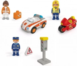 Tento hravý set pro malé průzkumníky přináší svět záchranářů přímo do dětského pokoje. Děti si užijí realistické scénky s lékařkou, policistou a hasičem na motorce, zatímco se učí pravidla silničního provozu díky funkčnímu semaforu se změnou světel.