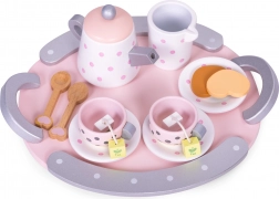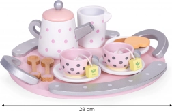 Souprava zahrnuje podnos, čajovou konvičku s víčkem, hrnečky s podšálky, lžičky, konvičku na mléko, talířek, „čajové sáčky“ a sladkou tečku v podobě sušenek – vše dokonale ladí a zve k nekonečným čajovým dýchánkům.