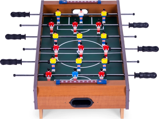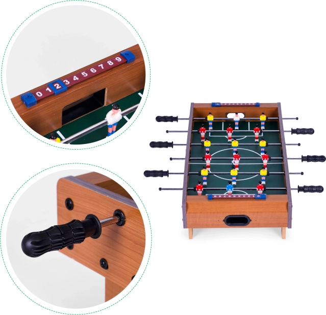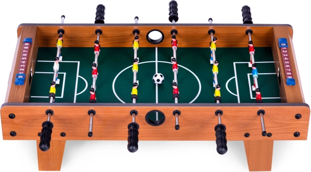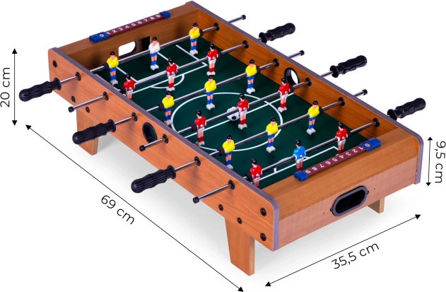 Mini stolní fotbal ECOTOYS je skvělou volbou pro rodinné a přátelské setkání. Dva bodové počítadla a neklouzavé rukojeti zajišťují snadnou a pohodlnou hru pro dva hráče. Konstrukce z dřevěných materiálů je kompaktní s rozměry 70x35 cm, což umožňuje umístění stolu i do menších prostorů.