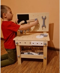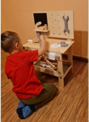 Dílna podporuje učení hrou – děti si procvičí manuální dovednosti, logické myšlení a trpělivost. Různé nástroje a spojovací díly vybízejí k experimentování: od utahování šroubků přes řezání pilkou až po nastavení úhlů úhelníkem. Ekologické provedení ze dřeva je šetrné k přírodě a skvěle zapadne do dětského pokoje.