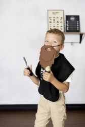 - Plstěné vousy, plášť, holicí strojek, lahvička s pěnou, ručník