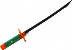 Černá čepel a výrazná oranžovo‑zelená rukojeť s geometrickým vzorem dodávají meči autentický styl. Lehký plast je vhodný pro dětské hraní a snadné manévrování.