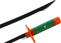 Tento samurajský meč pro děti věrně napodobuje legendární styl nichirin – má černou čepel a oranžovo‑zelenou rukojeť s geometrickým vzorem pro pevný a pohodlný úchop. Bezpečné plastové ostří s délkou cca 40 cm a rukojeť cca 15 cm podporují bezpečnou a kreativní hru.