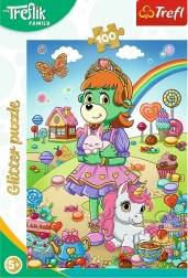 Puzzle s třpytkami Rodina Treflíků nabízí 100 brilantních dílků, které po sestavení vytváří nádherný obraz. Pokryté jemným zlatým třpytem potěší každého malého fanouška této oblíbené pohádky.