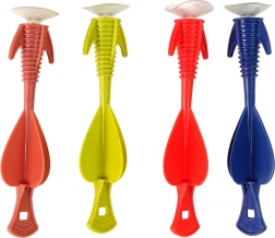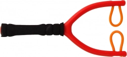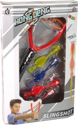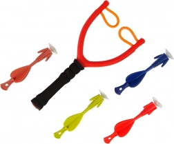 Balíček obsahuje červený prak a čtyři barevné střely s přísavkami pro bezpečné hraní.