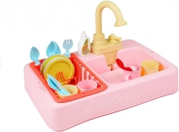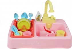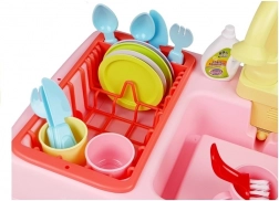 Dětský dřez věrně napodobuje skutečnou kuchyňskou činnost – po vložení 3× AA baterií a zapnutí začne kohoutek čerpat vodu, takže si děti mohou „na nečisto“ umývat talířky, kelímky i příbory. Barevné doplňky a odkapávač dělají z hraní poutavou a realistickou hru na domácnost.