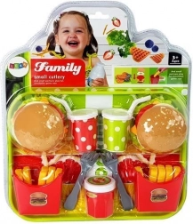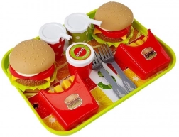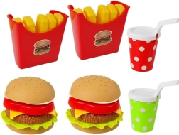 Zábavná dětská sada rychlého občerstvení se vším potřebným pro hraní na kuchaře: 2 rozkládací hamburgery, hranolkovače s hranolkami, 2 nápoje se slámkou, příbor a servírovací tác. Podporuje fantazii, role‑play a jemnou motoriku. Vhodné pro děti od 3 let, s CE a normou EN 71.