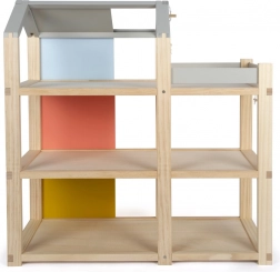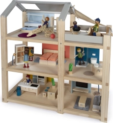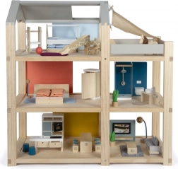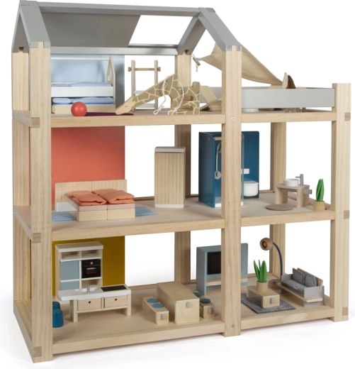 Tento dřevěný domeček pro panenky ve skandinávském stylu se třemi podlažími nabízí prostornou střešní terasu a plně zařízené místnosti, které podporují kreativní hru dětí.