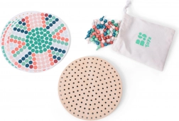 Dřevěná deska, pevné kolíčky a bavlněná taška pro přenášení i skladování. Hra vydrží mnoho hodin tvořivé zábavy.