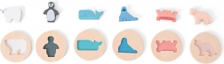 Tato kvalitní dřevěná vkládačka přináší dětem zábavu i učení v jednom. Zvířátka – tuleň, lední medvěd, krab, tučňák, liška a kosatka – se vkládají do kulatých žetonů s obrysovým výřezem a stejnou barvou, což usnadňuje orientaci a posiluje rozpoznávání barev a tvarů.