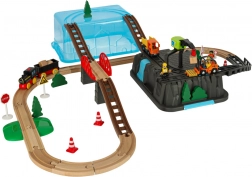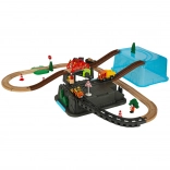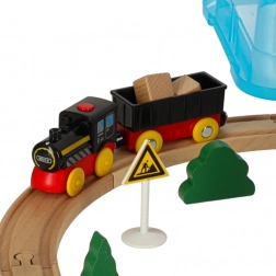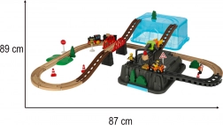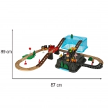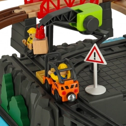 Tato komplexní dřevěná vláčkodráha přináší dětem fascinující svět dopravy a stavby. Z jednotlivých dílů postavíte členitou trať s převýšením, po které se sama pohybuje dřevěná lokomotiva. Tematické prvky staveniště – jeřáb, vysokozdvižný vozík, kužely a značky – vytvářejí realistickou scénu a zvou k otevřené hře.