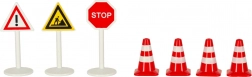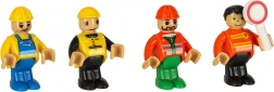 lokomotiva s vagónem, jeřáb, vysokozdvižný vozík, 4 figurky, 6 stromků, 3 dopravní značky, 4 kužely, paleta a náklad, úložný box, kolejové díly