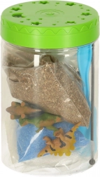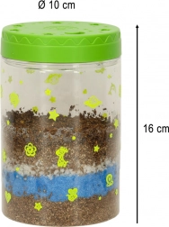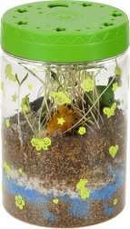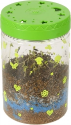 Průhledná plastová nádoba s větracími otvory je ideální pro výsadbu dodaných semínek. Součástí balení je země a barevné kameny, které děti umístí dle instrukcí. Diody LED v poklopu terrária podporují růst rostlin, zatímco přinášejí jemné noční osvětlení.
