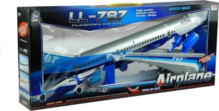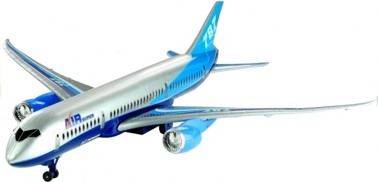 Stylový modro-stříbrný model letadla s realistickými detaily a nápisy AIR SUPER 787 potěší každého malého pilota. Nabízí třecí pohon kol pro jízdu po zemi, skládací přední podvozek a stabilní stojánek pro vystavení v pokoji. Vyrobeno z bezpečných, certifikovaných materiálů, ideální pro děti od 3 let.