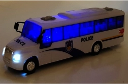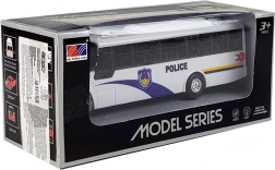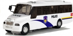 Kovový policejní autobus v bílé barvě potěší realistickými detaily, světelnými a zvukovými efekty i jízdou na zpětný nátah (Pull-Back). Délka 21 cm, průhledná okna, zrcátka a stříbrné poklice podtrhují autentičnost. Napájení 3× AA (nejsou součástí), vhodné od 3 let.