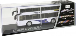 Udělejte radost malým milovníkům akce stylovým dvoupatrovým policejním autobusem. Díky napínacímu pull-back pohonu se autobus po natažení sám rozjede, přičemž světelné a zvukové efekty dodají hře realistickou atmosféru. Bílý design s modrými detaily, nápisem POLICE a emblémy působí věrně jako skutečné služební vozidlo.