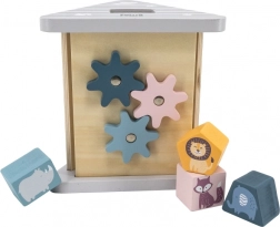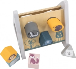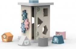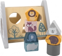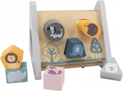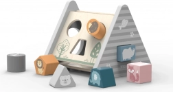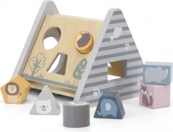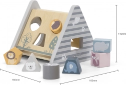 Dřevěný sorter POLARB v podobě stabilní „A“ pyramidy nabízí různé výřezy pro vkládání barevných kostek se zvířátky. Děti třídí tvary a barvy, učí se logice a trpělivosti a zažívají spoustu zábavy při objevování správných otvorů.