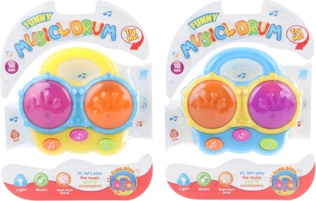 Zábavné plastové bubínky pro malé děti, které po stisknutí tlačítek svítí a vydávají veselé zvuky. Ideální hračka pro rozvoj rytmu a motoriky, s napájením na 2 AAA baterie (součást balení).