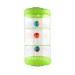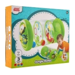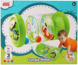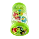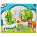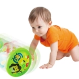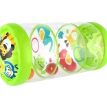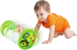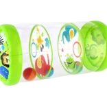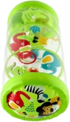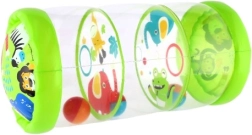 Válec je vyzdoben pestrými ilustracemi zvířat a obsahuje tři míčky, které při pohybu jemně chrastí, což baví a stimuluje děti.