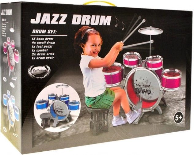 Dětská bicí souprava 5 dílů s pedálem a židličkou. Rozvíjí rytmus, koordinaci a kreativitu. Lehká, bezpečná a snadno sestavitelná.
