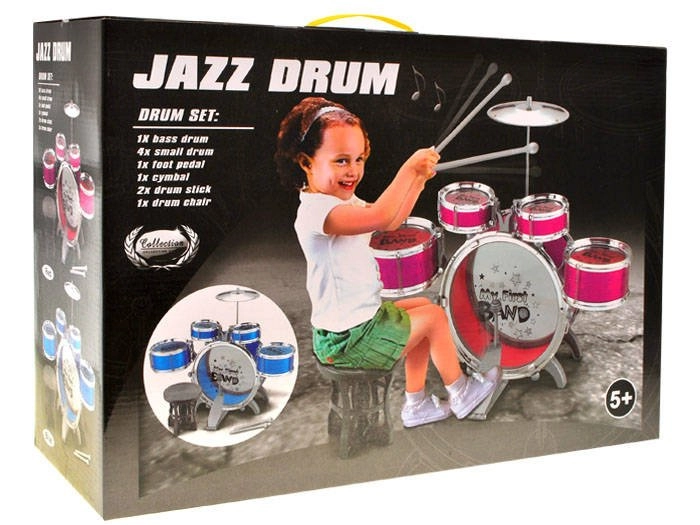 V balení najdete velký basový buben s pedálem, dva střední a dva malé bubínky, kovový talíř, židličku a pár paliček. Komplet je zabalen v kartonové krabici a připraven potěšit každého malého bubeníka.