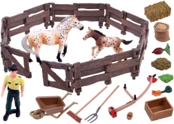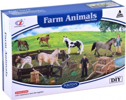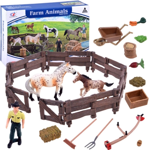 Tato bohatě vybavená sada přenese děti do světa farmy. Najdou v ní dvě věrně zpracované figurky koní (klisna a hříbě), farmáře, ohradu a spoustu doplnků jako kolečko, vidle, hrábě, koryto a krmivo. Realistické detaily, od textury "dřeva" na plotu po zbarvení koní, podněcují fantazii a dlouhé hodiny hry.