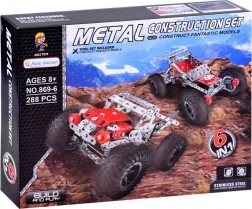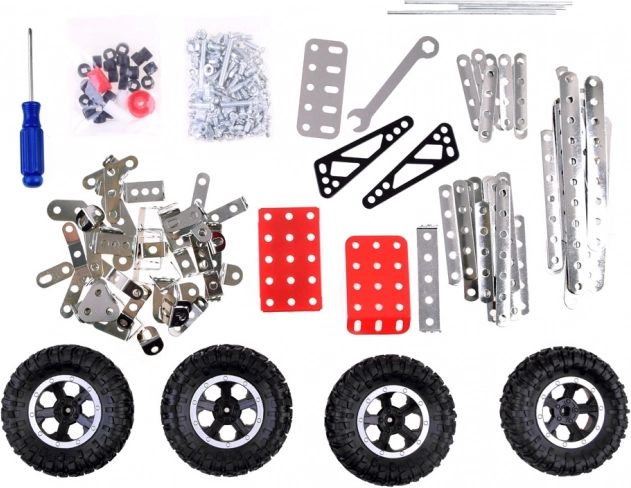 Kovové pásky, úhelníky, barevné plíšky, kola, šroubky a matičky doplněné šroubovákem pro snadnou montáž.