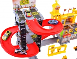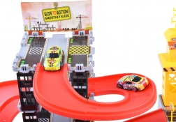 Víceúrovňová garáž s červenými tobogánovými rampami umožní plynulé sjíždění aut a dynamickou hru. Místa k parkování i vjezdy podporují realistický provoz.