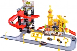 Postavte si vlastní město! Čtyřúrovňové parkoviště se sjezdy, místy k parkování, čerpací stanicí a dopravním značením se širokou cestou napojuje na stavební zónu. Děti mohou zaparkovat osobní auta a vyrazit se stavební posádkou na stavbu, kde je čeká jeřáb, bagr, buldozer i pneumatické kladivo.