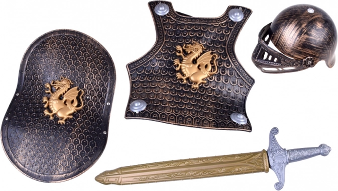 Zbroj, helma s pohyblivým hledím, štít a meč s pochvou – vše, co malý rytíř potřebuje pro velká dobrodružství a karnevalové převleky.