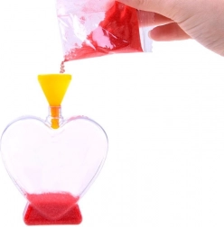 Práce s pískem je pro děti fascinující – učí se kombinovat barvy, vrstvit vzory a rozvíjejí fantazii. Díky jednoduchému plnění je tvoření intuitivní a uklidňující. Různé tvary lahviček i přívěsků dávají prostor pro nápadité kompozice.