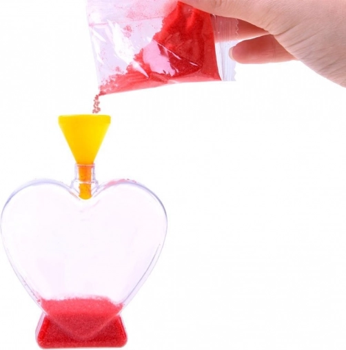 Díky praktickému trychtýři snadno nasypete písek do úzkých hrdýlek a vytvoříte precizní vrstvy bez nepořádku.