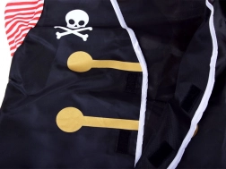 Stylový dětský pirátský kostým pro maškarní bál, karneval i Halloween potěší každého malého dobrodruha. Součástí jsou ikonické doplňky: pirátský klobouk, meč, teleskopická luneta, páska na oko a blůza s pruhovanými rukávy. Kostým je pohodlný, lehký a vhodný pro děti od 3 let.