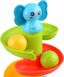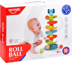 Tato barevná spirálová kuličkodráha se sympatickým sloníkem na vrcholu zaujme děti okamžitě. Šest barevných platforem vytváří plynulou dráhu, po které se kuličky svižně kutálejí a přitom příjemně chrastí. Sloník má měkké gumové ouško vhodné jako šetrný kousátko pro prořezávající se zoubky.