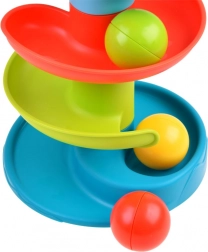 Pouštění kuliček z vrcholu a jejich chytání dole přirozeně trénuje jemnou motoriku a koordinaci oko–ruka, zatímco dítě sleduje plynulý pohyb po spirále.