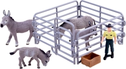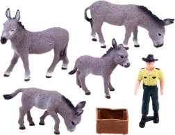 - 2 dospělí oslíci, 2 mláďata oslíka, farmář, koryto, ohrada