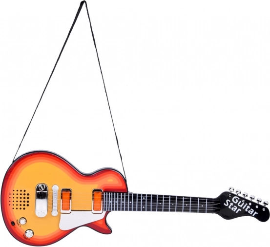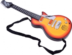 Součástí balení je popruh pro pohodlné nošení a hraní ve stoje. Kytara je vyrobena z odolného plastu, napájena 3× AA (nejsou součástí) a skvěle podporuje rytmus, motoriku i sebevědomí malých hudebníků.