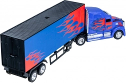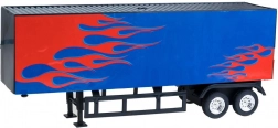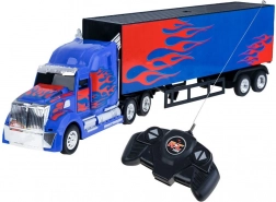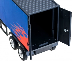 Skvělá hračka pro všechny malé motoristické nadšence, kteří sní o řídění amerického tahače. Tento kamion s návěsem na dálkové ovládání v modré a červené barvě s ohnivými detaily přináší nejen estetický zážitek, ale i funkční prvky. Vyrobeno z plastu, což zaručuje odolnost a snadnou manipulaci. Součástí je odnímatelný návěs a otevíratelné dveře pro naložení zboží, což přidává na realističnosti hry.