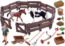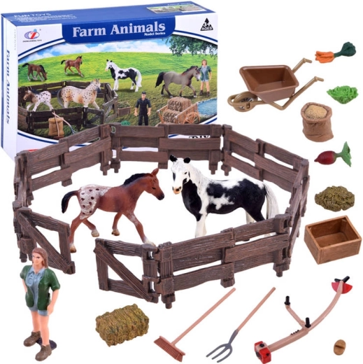 Tato komplexní sada přináší na váš stůl kompletní scénu života na farmě. Najdete v ní velkého koně, roztomilé hříbě, figurku farmáře a řadu nástrojů a doplňků pro péči o zvířata. Realistické proporce, výrazné barvy a precizní detaily dělají ze sady skvělou hračku i edukativní pomůcku.