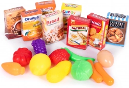 Součástí jsou ovoce, zelenina, vejce, uzeniny a krabičky s potravinami – ideální pro třídění, nápodobu nákupů a učení základů domácích prací.