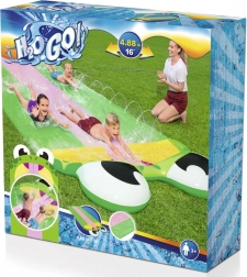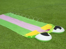 Montáž je rychlá a snadná – jednoduše rozviňte skluzavku na trávě, připojte zahradní hadici a zábava může začít!