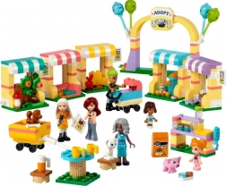 Barevné stánky, oblouk „Adopt“ a domečky pro zvířata vytvářejí autentickou atmosféru dne adopce. Děti párují mazlíčky s novými majiteli a odjíždějí s nimi v přívěsu.